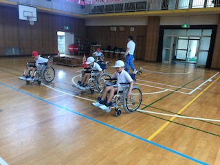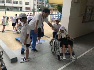 7月2日(月)に車いす体験を行いました。3時間目に講堂で車いすの部分の名前や、扱い方を聞き、自走体験をしました。スロープや2cmの段差にとても苦労していました。4時間目には外に出て、介助体験をしました。進むとき、段差を登るときなど、一つ一つ乗っている人に声をかけて介助していました。困っている人をみたら、この経験を生かして手助けしてほしいです。