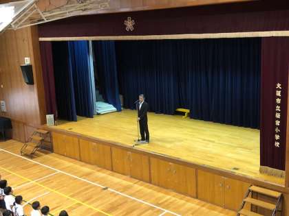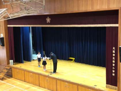 9/10(月) 本日の児童朝会は、まず、ポスターの作品の表彰が行われました。次に、校長先生からは、大きな被害をもたらした先日の台風のことや、いつ災害が起こってもおかしくないというお話がありました。