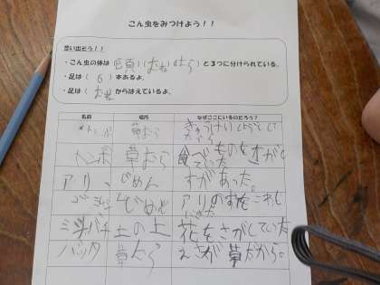 理科の時間に学習園に行き、生き物探しをしました、ダンゴムシやトンボなどを見つけましたね!また、どうしてその場所にいたのかも考えました。自分なりの考えをもっておこうね!