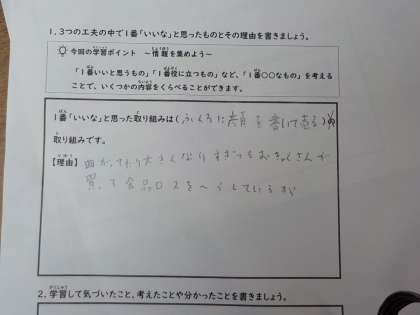 3年生は総合的な学習の時間に食品ロスをへらすために自分たちにできることを学習しています。「手前取り」「買いすぎない」「自分の食べる分だけ買う」など様々のことを意識していこう!
