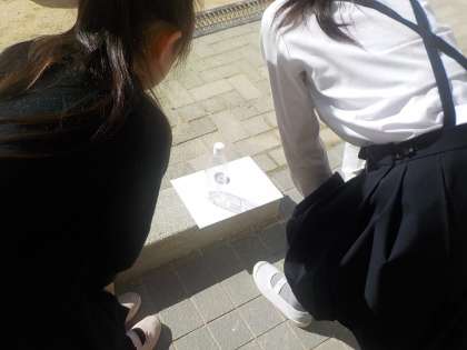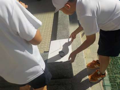 3年生は理科の時間に影の観察を行っています。時間によって影の向きが変わることがわかりましたね。自分たちで実験計画をたてて実験しています。