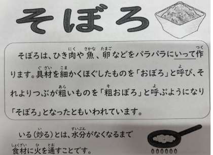 そぼろは、ひき肉や魚、卵などをパラパラに炒って作ります。具材を細かくほぐしたものを「おぼろ」と呼び、それよりつぶが粗いものを「粗おぼろ」と呼ぶようになり「そぼろ」となったともいわれています。