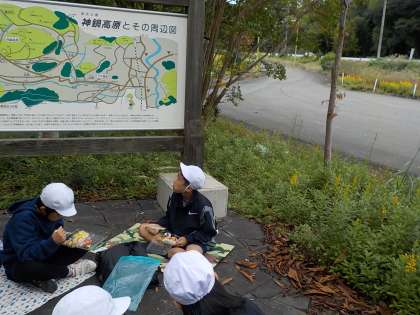 予定より早く、無事に神鍋に到着しました。昼食のちらし寿司弁当を食べ、今から溶岩流散策に出発します。緑の山々に囲まれて、たくさんの自然を感じましょう。