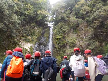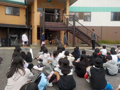 溶岩流散策でたくさん歩き、とても綺麗な八反の滝を見ることができました。その後、名色ホテルに着き、開舎式と避難訓練を終えました。全員けがをすることもなく、元気に過ごしています。