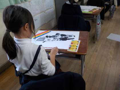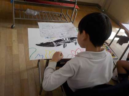 自分たちで作りだした恐竜と遊んでいるところを描いています。それぞれの思いが絵に溢れています。作品展をお楽しみに!