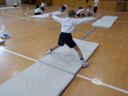 マット運動では、前後転や開脚系の技を練習しています。班のみんなで技をそろえるシンクロマットの発表会に向けて、話し合いをしながら練習を重ねています。苦手な技も少しずつできるようになってきましたね。音楽の拍子に合わせながら、楽しく活動しています。