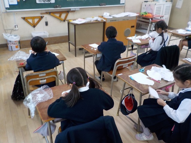 図工の時間に紙版画をしました。自分の顔を画用紙で作っていきます。