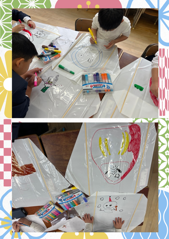 生活科の学習で凧に絵を描きました。お正月や冬をテーマに、だるまや雪だるまなどを思い思いにあらわしました。「はやくとばしたいな」と、完成を楽しみにする声も聞こえてきました。季節の行事に親しみながら、表現する楽しさを味わう学習となりました。