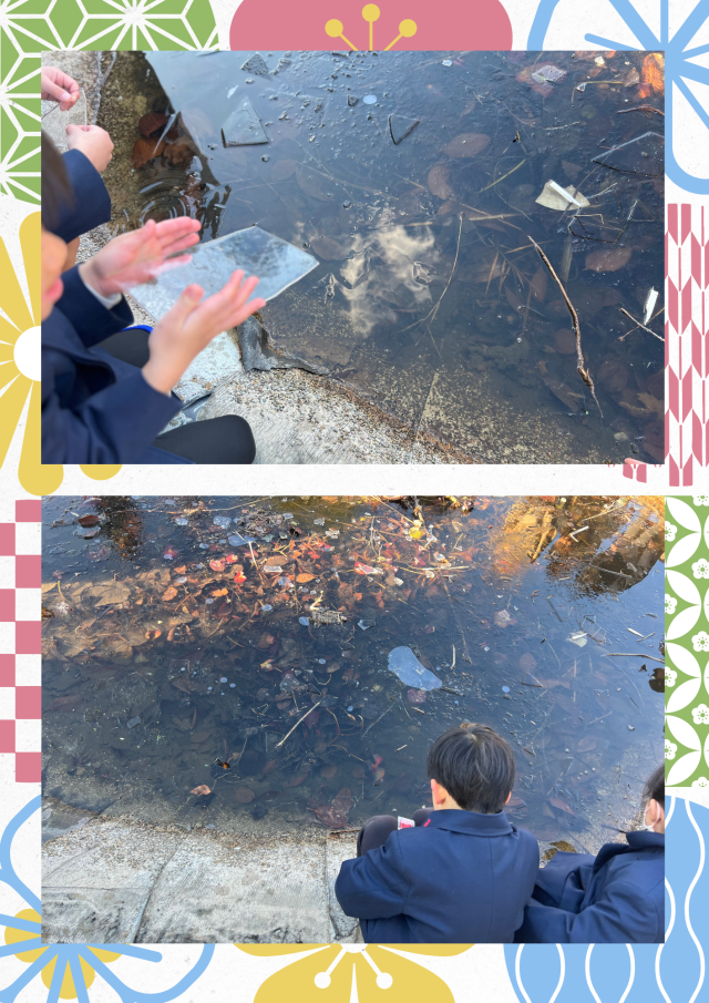 今朝学校に来ると・・・寒さで桜池の水が凍っていました。「こおっている!」「つるつるしてる!」と、子どもたちは驚いた様子でした。手で触れたり、じっと見たりしながら、冬ならではの自然の変化に気づくことができました。身近な環境から季節を感じる、大切な学びの時間となりました。明日はどうかな?観察するのが楽しみですね。