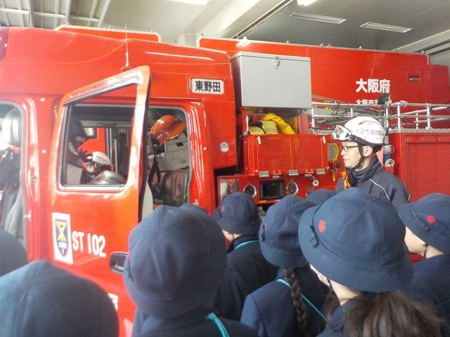 本日は社会科見学で都島消防署東野田出張所さんのお邪魔しました。市民の安全安心のために命がけの仕事をしてくださっている消防士さんよりいろいろなことを教えていただきました。消防設備や消防車の中など、普段は近くで見れないものを丁寧に説明してくださいました。安心安全のまちづくりのために自分たちにできることをさらに考えていくいい機会となりました。都島消防署東野田出張所の皆様、本日はありがとうございました。