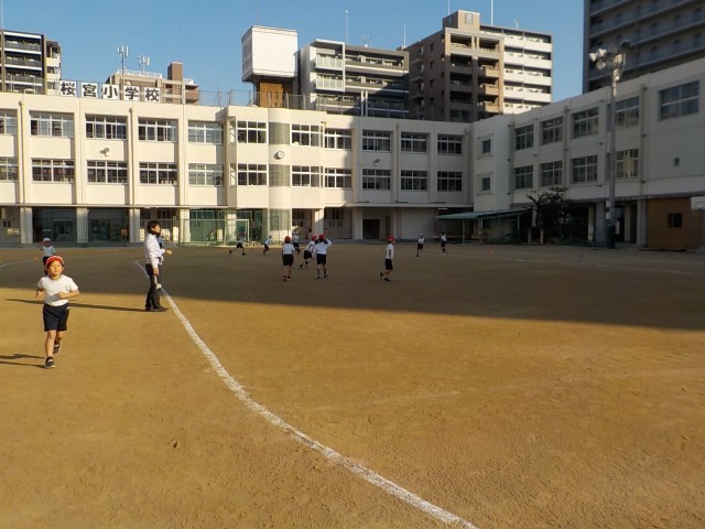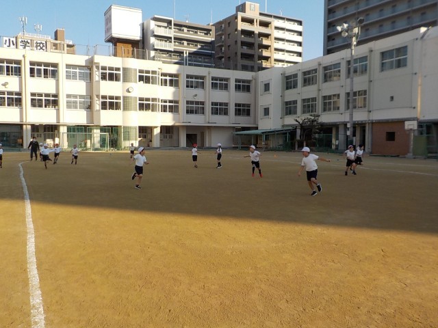 トラックを使った鬼遊びや、チームで20周を走るミニ駅伝のような活動をしました。