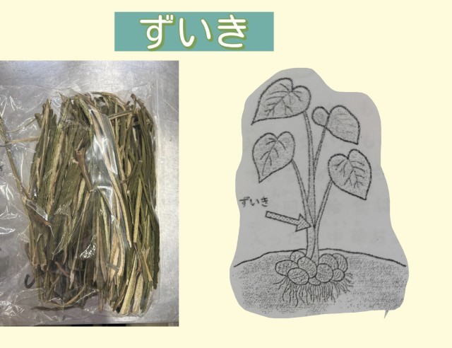 さといもの葉と茎をつなぐ部分を「ずいき」と呼びます。干しずいきは、ずいきの皮をむいて、水にさらした後、乾そうさせたものです。今日の給食では、「豚肉と干しずいきのみそ煮」に使っています。