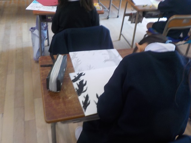 3年生は図画工作科でしかけ絵を製作しています。国語科で学習した『ゆうすげ村の小さな旅館』に関する絵です。それぞれのしかけがとても面白いです!!
