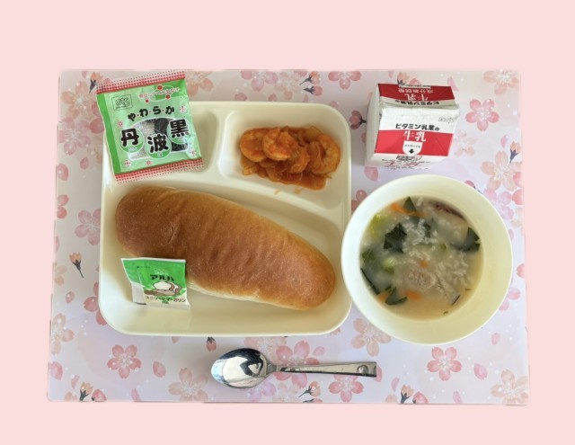 えびのチリソースいためは、トウバンジャンが入り少しピリッとした辛みがあります。大おかずには中華がゆが出ました。米のほかに、肉だんど、チンゲンサイ、だいこん、にんじん、しいたけが入っています。ソフト黒豆は甘納豆のような甘い味で、子ども達に人気です。