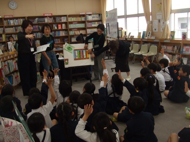 本校で図書ボランティアをしてくださっている「さくぽんさん」から、図書室の正しい使い方についてガイダンスをしてもらいました。