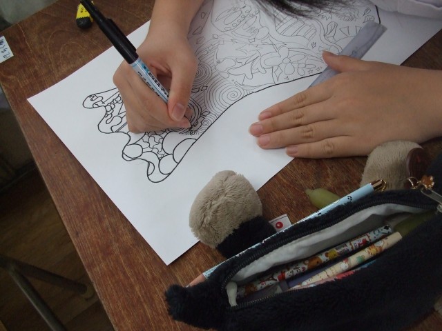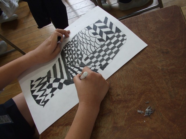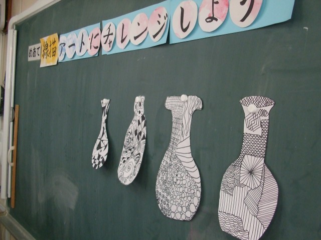 5年生の図工では、線描アートにチャレンジ!みんな思い思いに様々なデザインの壺を書き進めます。