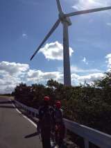 なぞときハイキングは、 頂上の風力発電所まで。 眼下には群青色の鳴門海峡が広がり...