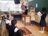 図書ボランティア「さくぽん」の皆さんと、図書委員会の5・6年生児童が、朝の会の時...