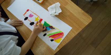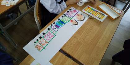 1組も2組も図工で、「みんななかよし1年1組・2組号出発!」と列車に自分や友だち・好きなものを乗せて、パスで一生懸命描いています。