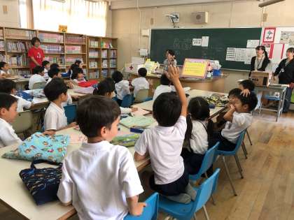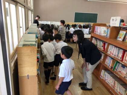 図書館の使い方について、図書館補助員の川田さんが指導していただきました。アンファンさんもたくさんお手伝いに来ていただきました。みんな、”ワクワクです”