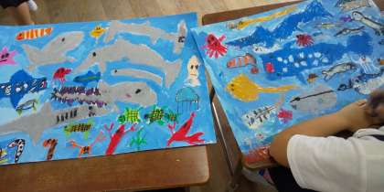 遠足で行った海遊館で見た生き物を画用紙いっぱいに描きました。絵の具を初めて使って水を表現しました。