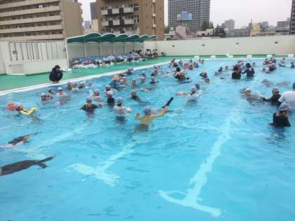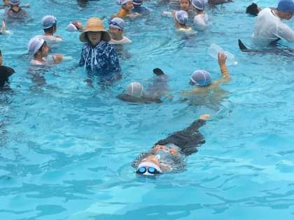 今日は3年生から6年生が着衣泳にチャレンジしました。水着とは違う感覚に子どもたちはドキドキ。水の中に入ってみると「動きにくい」「服が重たい」と感想を言ってました。