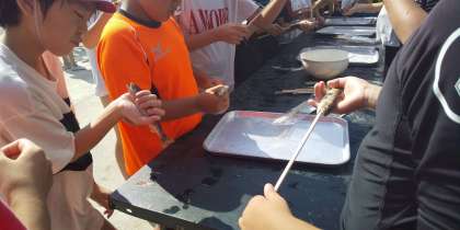 アマゴやイワナをくしに刺して焼く準備をしました。
