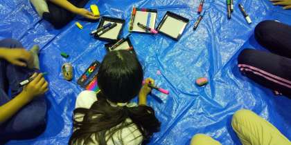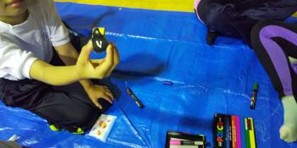 1組、2組交代で昨日川で見つけたストーンに字や絵を書きました。石の形をいかして絵を描いた人もいました。