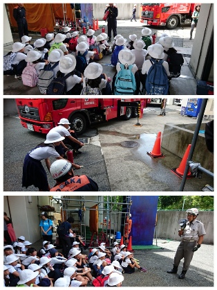 次に、クラスに分かれて、消火器の体験と、消防自動車の説明・酸素ボンベを背負う体験をさせていただきました。どの子も説明をよく聞いて「ピン・ポン・パン」のリズムで消火器を上手に使うことができました。酸素ボンベの重さに多くの子が驚いていました。