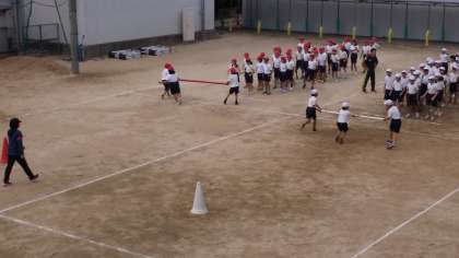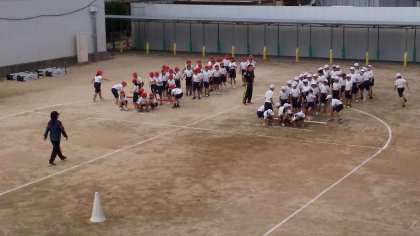 今日の集会は、運動会のトラックがいつもと違うので全校で椅子を実際に並べてみました。