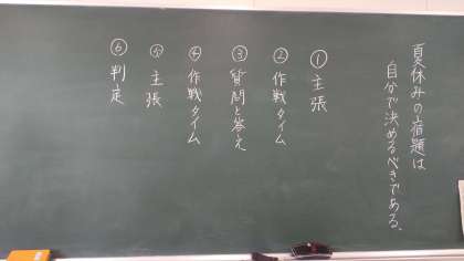 夏休みの宿題は自分で決めるべきという題で賛成派と反対派に別れて討論をしました。