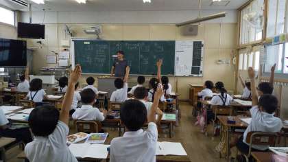 3けたから2けたのひき算のひっ算のチャレンジ問題をしました。105−57のように10の位が0のときは100の位から借りてくるやり方を説明することができていました。一生懸命手を挙げています。