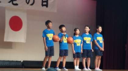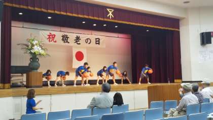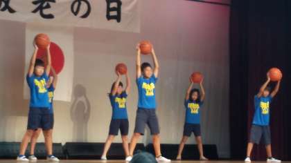 9月16日の午後、都島区民センターで行われた中野連合町会主催の敬老のつどいにミニバスケットボール部の有志となわとびの有志でドリブルリングとリズムなわとびを披露しました。