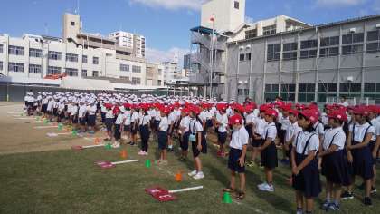 今日も良い天気です。赤・白組の応援団長の自己紹介の後、全校児童で運動会の歌の練習をしました。「赤・赤・赤・・・」「白、白、白・・・」と元気な歌声が響き渡っていました。