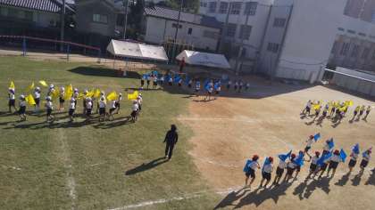 黄色と青色のフラッグを持ってみんなで心を合わせて演技します。