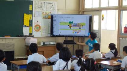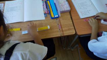 今日の算数は、3つのかずのけいさんを勉強しました。最初にバスに乗ったり降りたりするお話をデジタル教科書で見て、式を立てました。5−3+4の計算の仕方をみんなで考えました。おはじきを使う子、ブロックを使う子それぞれが実際に操作をして計算しました。