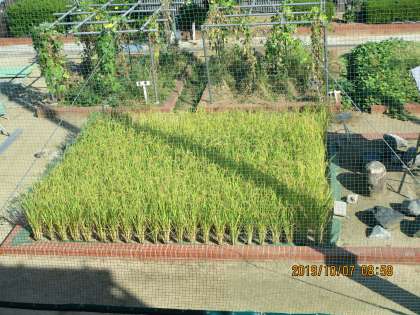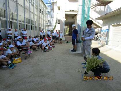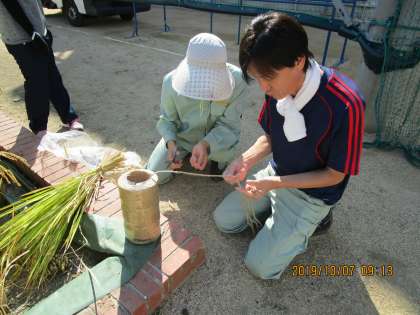 次に、まとめた稲を二つに分けて干しました。脱穀やもみすりは奥田さんが持って帰ってしてくださいます。玄米になって戻ってきた中野米を精米機で白米にする予定です。無農薬で育てた中野米を調理実習でみんなで食べるのが楽しみです。
