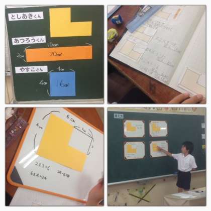 英語のLみたいな形?長靴?表彰台・・・・? 4年生の研究授業です。今まで学習した長方形や正方形の面積の求め方を使って、工夫して解くことがめあてです。