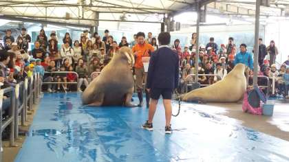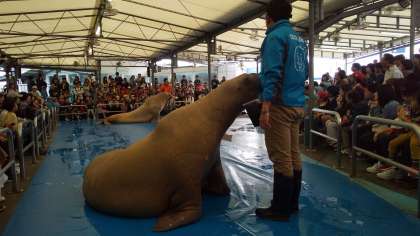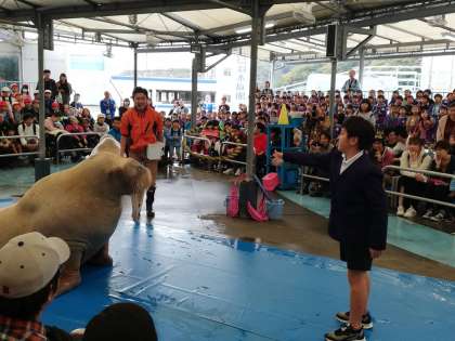 セイウチのショーを見に行きました。ショーのお手伝いをする人に中野小の6年生が選ばれました。ご褒美にセイウチからのキスもしてもらいました。ショーを盛り上げる中野っ子。流石です。