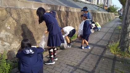今日は、地域の方や保護者の方と中野の町をきれいにしようと子どもたちは、地域子ども会の班に分かれて公園を中心に清掃に出かけました。