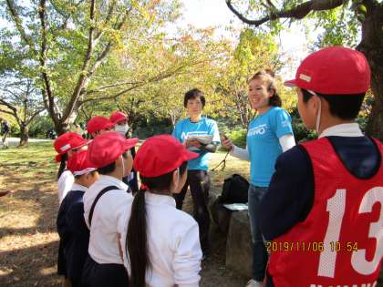 山の広場のポイントでは、みんなで校歌を歌いちょうど10秒で止めれるかに挑戦せていました。