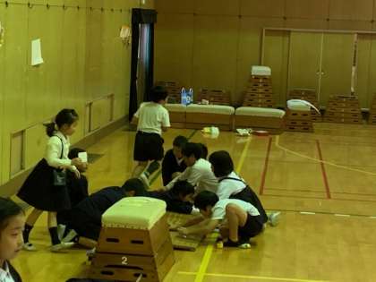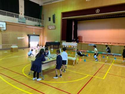 2年生が生活科の学習で「おもちゃパーティー」を開催しました。体育館のいたるところにおもちゃのコーナーがありました。手作りのパラシュートで遊んだり、魚釣りゲームで楽しんだりしました。最後には自分たちが使った場所をきれいに片づけました。