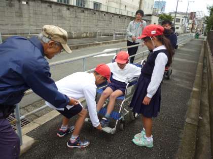 そして、第二弾として、社会福祉協議会や都島区障害者相談支援センターの方々に協力していただき、『車いす体験』を行いました。