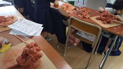 5年生は、作品展に向けてシーサー作りをしています。顔の部分を仕上げて胴体と引っ付けていきます。