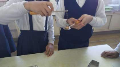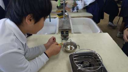 「金属は、温度によって体積が変わるか」を実験しました。金属の玉が温める前は、輪っかを通っていたのに温めるとどうなるか?冷やすとどうなるか?