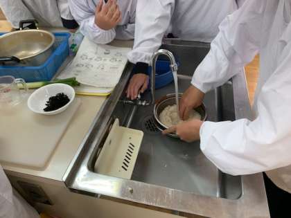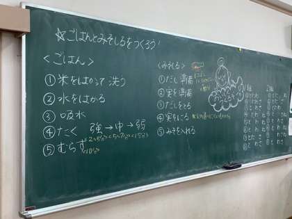 5年生は春に田植え、秋に稲刈りをして育てた「中野米」をつかっての調理実習です。地域の方のご協力をいただき、立派な米が約5kg出来ました。今日はご飯に合うみそ汁も一緒に作ります。おいしいご飯が炊きあがるか楽しみです。