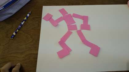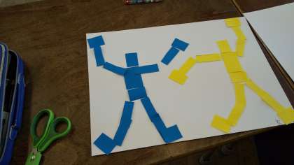 色画用紙で体の部位を関節で分けていろいろなポーズを作りました。「どんなポーズになるのかな?」