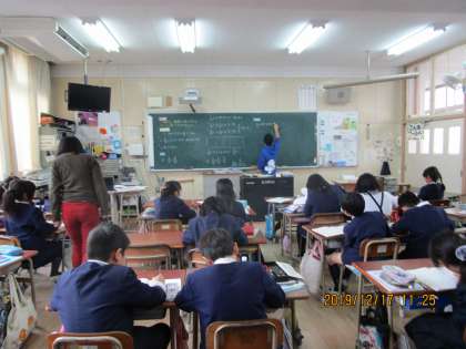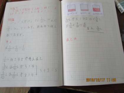 分数のたし算の仕方を学習しました。分母が同じなら、分子を足せばよいことを水の量で考えて学習しました。習熟度別少人数指導でデジタル教科書も使って理解を深めています。