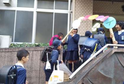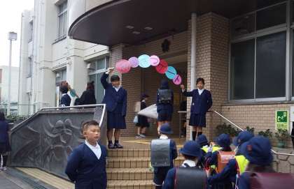 月曜日から門の階段の上であいさつゲートを児童会議メンバーがもってみんなを迎えています。大きな声であいさつができる子が増えてきています。
