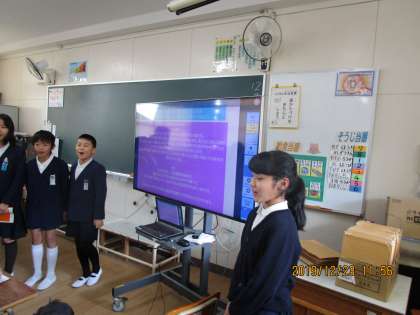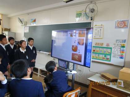 今日は、それぞれの班でタブレットを使って調べたことをパワーポイントでまとめ、みんなに発表しました。絵や写真を入れたり、分かりやすく小見出しを付けたりと、工夫していました。発表後の感想では、「調べたことを要約されていたのがよかった」「感想が書かれてあるのがよかった」「花火のことで自分たちも気を付けた方がいいことを調べていてよかった」など、友だちの頑張りをしっかり認められていました。